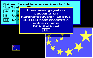 "L'Europe, 500 millions de pratiquants, un seul croyant !" scandait la voix off des guignols pour commenter la marionnette de Delors en train de brûler son énergie à téléphoner à tous les chefs d'Etat et de Gouvernement pour les convaincre de négocier la ratification des Accords de Maastricht. Oui, en 1992, le Franc et la Lire étaient encore les monnaies nationales en Hexagone ou dans la Botte. Entre la Grèce et l'Italie, il y avait les Balkans déchirés par les guerres de l'Ex-Yougoslavie, et le monde hébété vivait les premières heures post-guerre froide. En 1992, l'Europe songeait à se transformer en une Union fédéraliste. La marche vers les Etats-Unis d'Europe. Europe apparaît autant un logiciel éducatif destiné aux jeunes et aux familles qu'un outil de propagande pour aider les plus indécis à adopter le vote pro-européen de la future ratification. Seul ou à deux joueurs, et six au maximum, vous allez tenter de remporter un challenge bien curieux : vous allez visiter les douze capitales européennes de l'époque, et tenter de retrouver l'argent dépensé. Ah oui, j'ai oublié de dire que vous commenciez votre visite avec 600 Ecus (ce qui correspond peu ou prou aux Euros aujourd'hui). A votre arrivée dans la capitale, vous allez pouvoir participer à une phase d'action : le Jeu de la bourse, le Labyrinthe, la machine à sous, rattraper des pièces avec une barque... Et chaque action vous permettra de regagner de l'argent. Attention, car vous risquez d'en perdre ! Il va falloir rester vigilants si l'on ne veut pas être ruinés, donc éliminés. Lorsque vous retournez dans une capitale déjà visitée, la phase d'action n'est pas proposée. Et si vous perdez tout votre capital, vous pourrez bénéficier de cinq jokers. A la fin du jeu, quand un joueur a visité toutes les capitales, il doit regagner Bruxelles pour répondre à cinq questions au sujet de la Construction Européenne. En outre, à chaque passage dans une des capitales, vous allez devoir répondre à une série de questions, afin de gagner une petite somme d'agent, et des souvenirs. On l'aura compris, ce logiciel est destiné à tous les récalcitrants à la Construction Européenne. Jeu éducatif ou outil de propagande ? un peu les deux, sans doute !