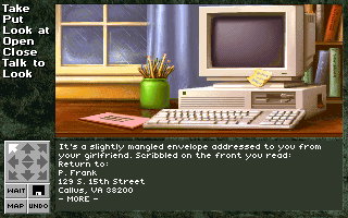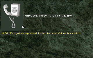 Le jeuLe titre commence par une scène extrêmement banale digne des titres les plus médiocres. Vous êtes chez vous devant votre ordinateur par une journée des plus pluvieuses. Puis le téléphone sonne... Le jeu connaît différentes solutions pour les dialogues. Mais au final, il n'y a pas vraiment de choix pour faire progresser l'aventure. Votre avatar va se mettre à jouer aux "Compagnons de Xanth"... Et vous voilà propulsé dans le jeu.