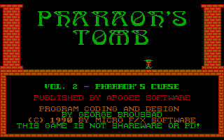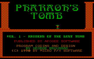 HistoriquePharaoh's Tomb est un jeu développé par le co-fondateur d'Apogee Software Productions George Broussard. Le jeu est édité par sa société Micro F/X Software avant qu'il ne fonde avec Scott Miller le studio légendaire qui deviendra par la suite 3D Realms Entertainment.