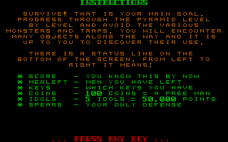 ConclusionPharaoh's Tomb est un titre sympathique, dont l'unique défaut est d'être sorti trop tard. Complètement ancré dans l'esprit des jeux de plate-formes des années 80, il fait pale figure par rapport à un titre comme Rick Dangerous ou Dangerous Dave.