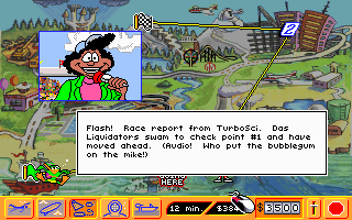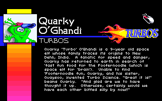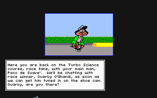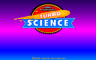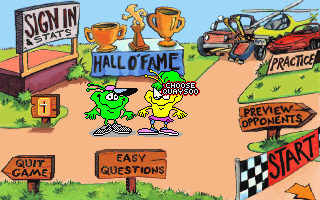 Contrairement aux apparences, vous n'êtes pas en possession d'un jeu de Formule 1 ou d'une nouvelle simulation de rallye. Ce n'est pas non plus un jeu d'aventure pour les plus jeunes, ni même un éducatif au royaume de la mécanique. Vous venez d'ouvrir la page du descriptif d'un quiz, qui s'inscrit dans la Collection "Discovery" que Sierra a développée en 1991-1993.Cette collection, dirigée par les époux Cole, a fait naître des pépites comme les premiers Docteurs Brain (Castle et Island) ou Pepper's Adventures in Time. En apparence, Quarky and Quaysoo, petits elfes de l'espace, vous emmènent dans un monde aux couleurs de l'enfance. Et à regarder l'écran du menu, avec sa musique déjantée et ses bruitages cartoonesques, on sent un gameplay adapté aux plus jeunes. Mais quand vient le temps du challenge, on s'aperçoit que le jeu cible davantage la tranche 11/14 ans. Dans le menu, vous choisissez qui, de Quarky ou de Quaysoo, va conduire à vos côtés la course contre l'une des trois équipes de crétins antipathiques qui ont juré de vous faire manger l'asphalte. Vous réglez vos options, entrez votre pseudonyme, et hop ! C'est parti !