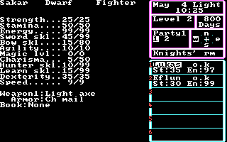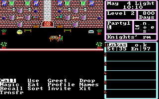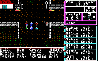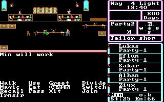 Hélas pour les copies d'Obélix, The Magic Candle ne permet pas ce genre de facéties car les magasins ferment à une heure raisonnable. C'est heureux de pouvoir bénéficier des commerces car vos aventuriers ont faim et soif (la leçon de Dungeon Master a été retenue) et leurs armures s'usent. Et comme il fallait un petit signe distinctif, il est possible de couper votre groupe en plusieurs sous-unités histoire d'explorer une zone plus vite ou d'éviter à tout le groupe de se faire occire (vous savez, le 6ème du groupe qui sert à rien, ben ici, il sert d'appât). Ah, et si vous doutez encore que ce titre est différent, on a ici à faire à des commandes de type "parler" "inviter"... Histoire de bien se faire comprendre des PNJ. Le procédé utilisé dans les "point & clicks" est ici bien adapté au monde du jeu de rôle.