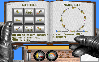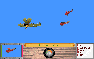 Le jeu se déroule principalement en vue de dessus avec trois possibilités : les missions d'entraînement (didacticiel), l'éditeur de missions et le mode carrière (où vous plutôt une série de missions en 1914). Les missions d'entraînement donnent un aperçu du jeu. Vous envoyez des bombes sur des cibles bien rouges et blanches ! Quant aux combats, il s'agit d'un ciel bleu dans lequel deux avions modélisés en 2D bougent et se tirent dessus. Ce n'est pas que lié aux mécanismes de jeu mais on n'a pas le côté décalé de Rick Dangerous pourtant de la même compagnie. Le côté arcade du jeu n'est pas vraiment plaisant à jouer.
