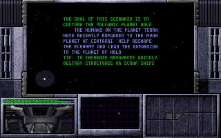 La cinématique introductive est assez réussie et nous immerge dans un univers hostile où différentes races veulent contrôler l'univers. Même pour l'année 1994, cela n'a rien de révolutionnaire mais les graphismes sont assez réussis et l'on se dit après tout : pourquoi pas.