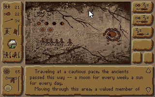 Le scénarioL'histoire commence mal pour vous. Dans des temps immémoriaux où l'Homme vivait en tribu et chassait le mammouth, votre tribu est victime d'une catastrophe climatique. Vous viviez tranquillement au pied d'un volcan qui s'est réveillé. Une partie de votre tribu a succombé et notamment votre chef et les meilleurs chasseurs. Parmi les membres restants, vous êtes le chasseur le plus expérimenté et il vous reviendra de prendre la tête de votre tribu. Votre mission ? Mener les vôtres vers leur terre ancestrale.