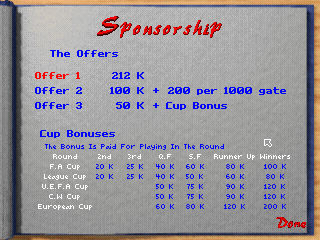 La première, puisque ici plus qu'ailleurs l'argent est le nerf de la guerre, sera de choisir un sponsor parmi trois offres qui vous seront proposées. Typiquement, il s'agit de prendre une offre au comptant, une offre de moindre valeur immédiatement mais avec un pourcentage variable ou des primes indexées sur votre parcours en coupe. Tout dépend bien sûr de l'équipe dont vous disposerez et de ce que vous comptez en faire ! Forte en coupe ? Régulière en championnat ?