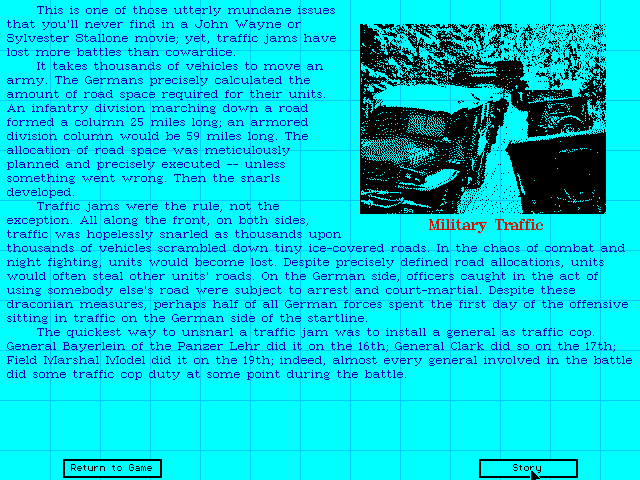 Dans cette optique, Crawford insista sur la partie histoire en proposant des entrées sur les différents aspects du conflit comme les encombrements des véhicules sur un théâtre d'opération, les généraux...