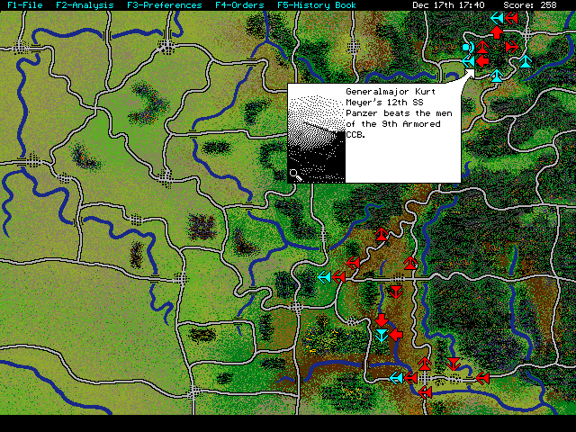 Toile de fondS'il y a bien une période qui a inspiré les créateurs de wargames, c'était la Seconde Guerre Mondiale. A vrai dire, on ne compte plus les innombrables titres qui en font leur sujet principal. Ne voulant sans doute pas prendre de risques, le créateur de Patton Strikes Back - The Battle of the Bulge a choisi l'une des offensives les plus célèbres de la seconde guerre mondiale : la bataille des Ardennes, où s'illustra tout particulièrement le général Patton. Celui-ci réussit ce que tout le monde pensait impossible :envoyer six divisions sous son commandement qui stationnaient aux environs de Sarrebruck pour les repositionner deux jours plus tard près de Bastogne. Ce coup d'éclat contribua puissamment à casser la dernière grande offensive allemande.