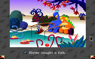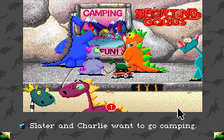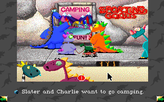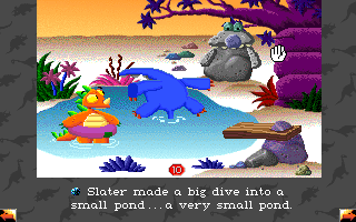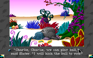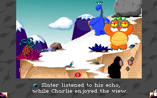 Encore un livre interactif plein de couleurs et de sons rigolos pour les enfants âgés de quatre à huit ans.Passé l'écran de menu, vous avez le choix entre le mode "lecture" et le mode "jeu". Personnellement, je n'ai pas vu de diffèrences significatives entre ces deux modes.Vous parcourez douze écrans qui narrent les aventures du fameux pétrosaure et de son amie Charlie (je pense que c'est une fille en raison de la comédienne qui prête sa voix à Charlie). A la montagne, au bord de la mer ou dans des activités de loisirs, nos deux aventuriers rencontrent des personnages hauts en couleurs et en cliquant sur tout ce que le curseur montre, l'enfant déclenche une animation accompagnée de bruits aigus ou graves, qui prêtent à sourire ou à froncer les sourcils. L'animation de l'écho est particulièrement cocasse, mais le monstre qui hurle dans la nuit ou dans la grotte a de quoi faire dresser le cheveu sur la tête des plus petits. Mention particulière à l'humour "vache", qui ressemble à celui de Oil's Well, avec tout un tas de mésaventures parfois franchement désagréables qui arrivent à Slater. Je pense à cette patte de brontosaure qui l'écrase dans son sommeil. Moi, je n'aurais pas trouvé ça très drôle à 4 ou 8 ans !