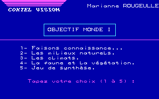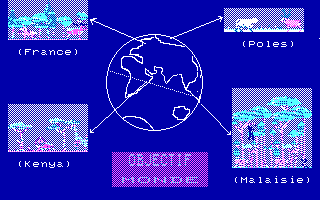 Le monde à portée des enfantsEn 1987, Coktel Vision lance une collection de ludiciels éducatifs teintés de géographie, avec quatre titres destinés aux collégiens. Objectif monde 1 est orienté classe de sixième; Objectif monde 2 est tourné vers la classe de cinquième, Objectif Europe est orienté vers les quatrièmes et Objectif France vise le public de troisième.