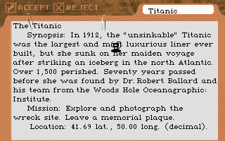 PrésentationBienvenue dans les profondeurs des mers. Vous avez aimé "20 000 lieues sous les mers", vous regardez avec avidité les documentaires sur les fonds sous-marins, vous avez toujours rêvé de voir des trésors en tout genre. Voilà en gros, l'idée de base de Discoveries of the Deep. Vous démarrez dans votre bureau le temps de vous voir confier une mission : mettre une plaque sur l'épave du Titanic. La suite se déroule en haute-mer où vous devez manoeuvrer votre bateau sur zone avant de descendre dans les profondeurs à l'aide votre sous-marin. L'ensemble est simple (peut-être trop pour une simulation), le gameplay perfectible, mais la variété des missions vous permettra de vous investir pendant quelques heures.
