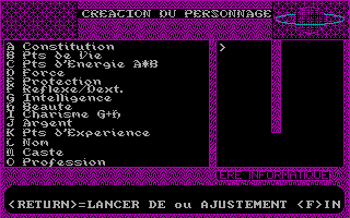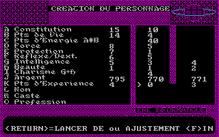 Création de personnageLe jeu débute par la création d’un personnage. Les caractéristiques: force, constitution, intelligence, etc. sont tirées aléatoirement de la manière suivante, vous pouvez choisir l’ordre dans lequel vous les obtiendrez et celui-ci est très important car le premier jet bénéficie d’un bonus de + 5, le suivant de +4 et ainsi de suite jusqu’à -2. Par exemple si vous souhaitez partir à l’aventure avec un guerrier, vous commencerez par la force, puis la constitution, ensuite les points de vie. Lorsque toutes les statistiques sont obtenues, vous pouvez alors choisir une classe, guerrier, magicien, prêtre ou voleur. C’est là que ça déraille, en effet, pour chaque profession, il y a des prérequis; par exemple, pour le guerrier il faut, entre autres, posséder une force supérieure ou égale à onze. Or, il est extrêmement difficile d’obtenir des résultats suffisants pour créer un personnage, vous serez donc amené à recommence cette phase de création de très nombreuses fois, ce qui deviendra très vite lassant.