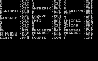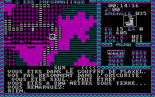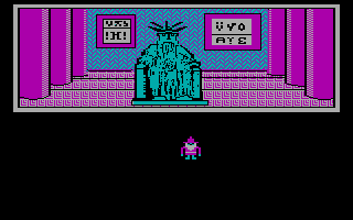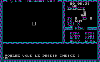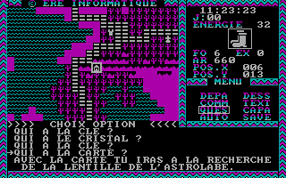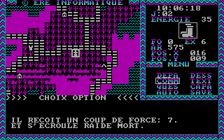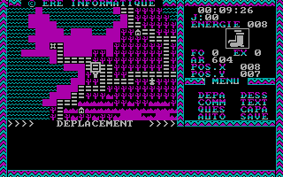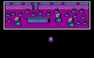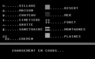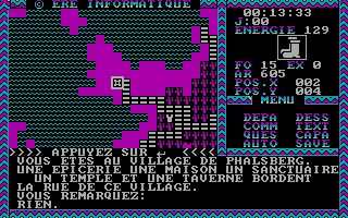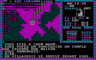 C'est pas beau, le CGAGraphiquement, le jeu est en CGA quatre couleurs. Si les graphismes stylisés sont clairs et lisibles, les dessins intermédiaires sont plutôt moches et franchement pas nécessaires. Le son se réduit à quelques bips désagréables. Le maniement du jeu se fait au clavier avec les flèches de direction. Comme dans la plupart des jeux de cette époque, il n’y a qu’un seul fichier de sauvegarde. Quant à la difficulté, c’est difficile à dire, si les combats sont en général assez faciles, je n’ai pas trouvé trace de gens ayant fini le jeu.