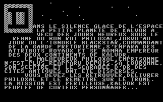 Nous coulions des jours heureuxLe scénario n’a rien de révolutionnaire. Perdu au fin fond de l’espace, la planète Kalvor coulait des jours heureux sous la férule du bon roi Philoxal mais l’abominable Blackstar lui ravit le trône et l’emprisonna au fin fond d’un donjon tout en prenant soin de disperser les reliques royales, symboles du pouvoir, aux quatre coins du monde. C’est à vous, noble apprenti héros, que revient la lourde tâche d’arpenter le monde pour réunir les précieux objets puis enfin de libérer le bon roi. Bon courage ! Ça ne va pas être du gâteau !