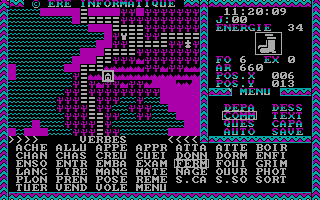 Une fois que vous aurez choisi un personnage d’une manière ou d’une autre, vous accédez à l’écran de jeu en lançant un second programme. La carte du jeu est en vue de dessus dans le plus pur style des premiers Ultima. Sur le côté droit est affiché un compteur de temps, un compteur d’énergie, la position de votre personnage et un menu qui contient les commandes principales du jeu qui sont décrites dans la documentation. En bas de l’écran, une zone contient les interactions du personnage avec son environnement.