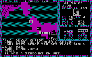 Errance sans butUne fois que vous aurez choisi un personnage d’une manière ou d’une autre, vous accédez à l’écran de jeu en lançant un second programme. La carte du jeu est en vue de dessus dans le plus pur style des premiers Ultima. Sur le côté droit est affiché un compteur de temps, un compteur d’énergie, la position de votre personnage et un menu qui contient les commandes principales du jeu qui sont décrites dans la documentation. En bas de l’écran, une zone contient les interactions du personnage avec son environnement.