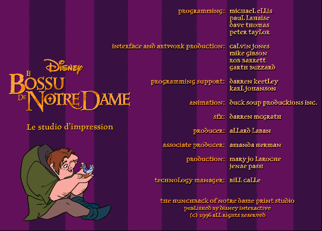PrésentationEn 1996, la renaissance de Disney est installée par le biais du cinéma d'animation, avec un film au moins chaque année, depuis "La Petite Sirène" (1989). Un film d'animation, un jeu vidéo, quelques produits dérivés pour le sapin de Noël, des joujoux Macdo à collectionner, une cassette VHS pour passer à l'année suivante... Ce cycle s'enrichit d'autres séries de jeux vidéo, avec la saga Print Studio ou Atelier de Jeux. Après "La Belle et la Bête", "Aladdin" et Le Roi Lion, le Bossu de Notre-Dame est le quatrième opus de cette série située à la charnière du jeu éducatif et de l'utilitaire.