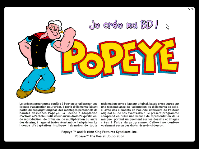 Inventé par l'Américain Elzie Crisler Segar en 1929, entré dans le domaine public européen en 2009, Popeye est l'un des personnages emblématiques de la BD américaine. Il a été dapté en dessins animés, films, jeux vidéo (et été l'inspiration indirecte d'un certain Mario)... Le voilà maintenant dans une série de logiciels de création de bandes dessinées. À l'aide de personnages, décors, objets et phylactères prédéfinis, vous allez pouvoir écrire vos propres BDs, en respectant le fomat de la presse américaine de trois cases par lignes. Tous les personnages principaux sont au rendez-vous. L'orientation des images peut être modifiée, mais pas leur taille. Il est aussi dommage que l'on ne puisse pas lire confortablement sa BD en WYSIWYG, le logiciel ne semble avoir été conçu que pour être utilisé avec une imprimante.