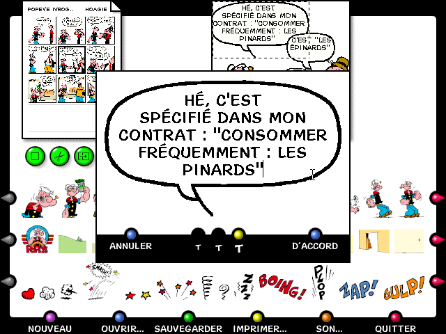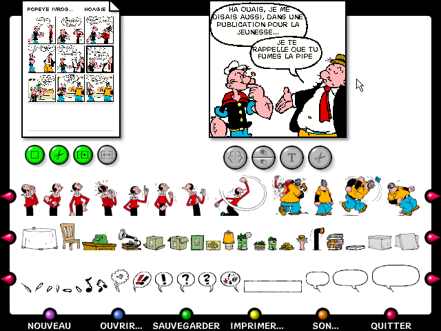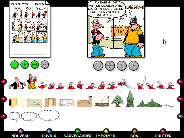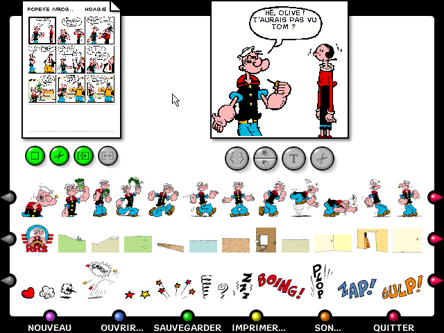 PrésentationInventé par l'Américain Elzie Crisler Segar en 1929, entré dans le domaine public européen en 2009, Popeye est l'un des personnages emblématiques de la BD américaine. Il a été dapté en dessins animés, films, jeux vidéo (et été l'inspiration indirecte d'un certain Mario)... Le voilà maintenant dans une série de logiciels de création de bandes dessinées. À l'aide de personnages, décors, objets et phylactères prédéfinis, vous allez pouvoir écrire vos propres BDs, en respectant le fomat de la presse américaine de trois cases par lignes. Tous les personnages principaux sont au rendez-vous. L'orientation des images peut être modifiée, mais pas leur taille. Il est aussi dommage que l'on ne puisse pas lire confortablement sa BD en WYSIWYG, le logiciel ne semble avoir été conçu que pour être utilisé avec une imprimante.