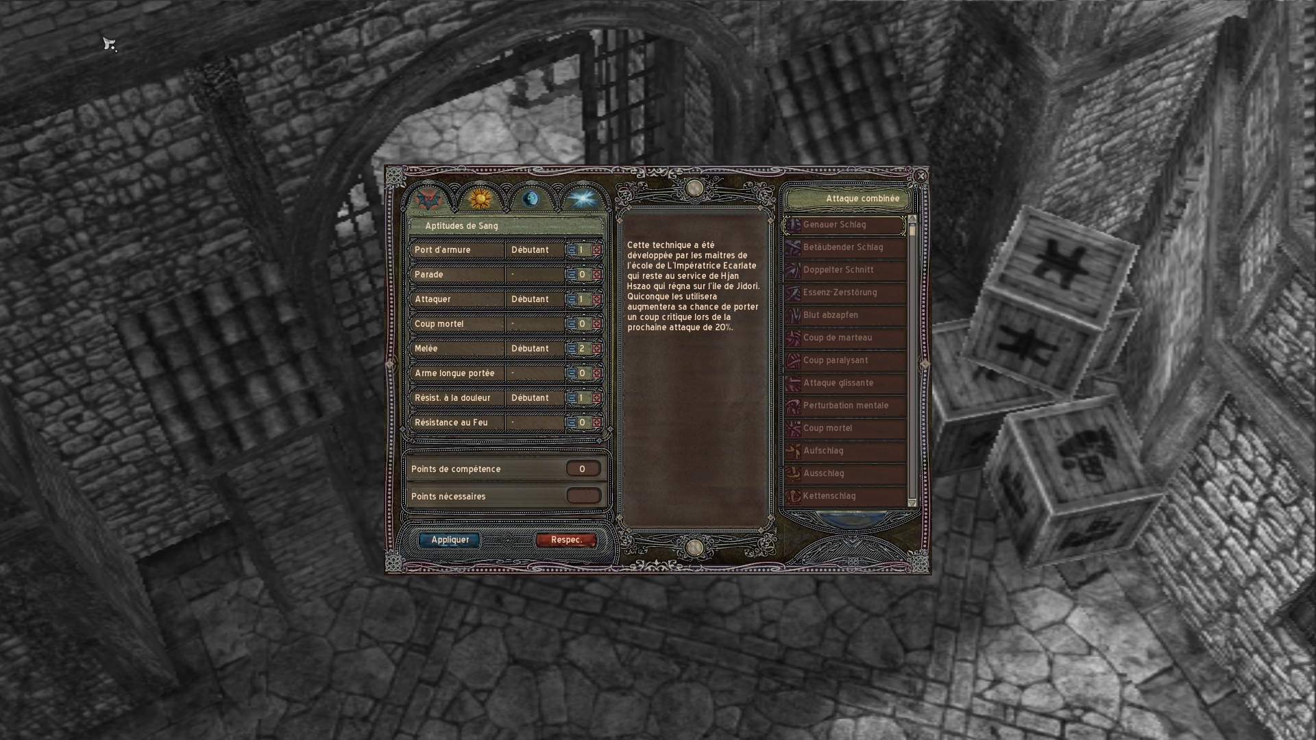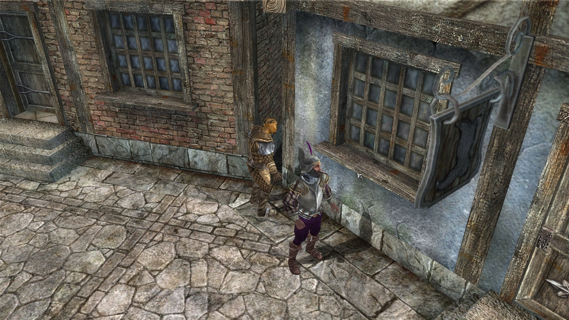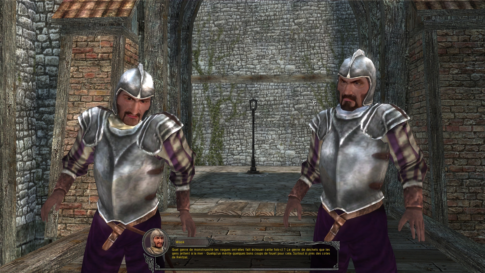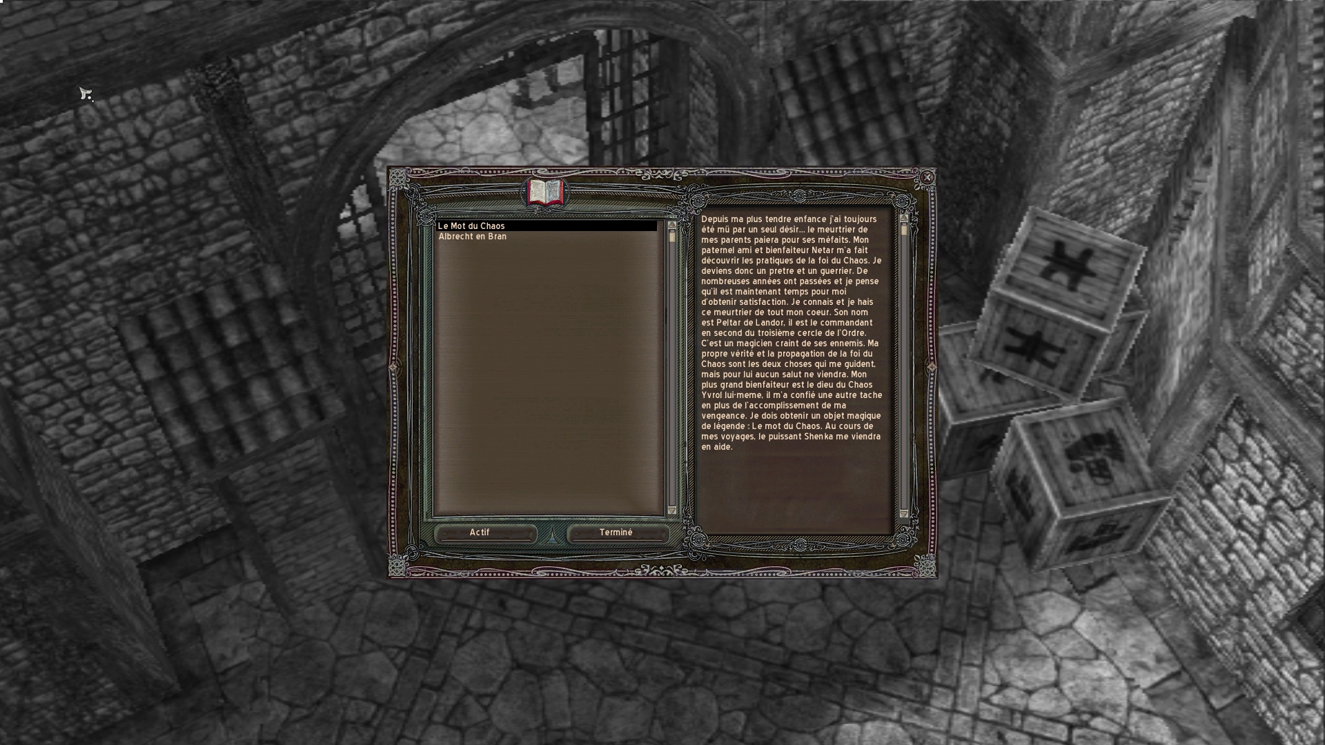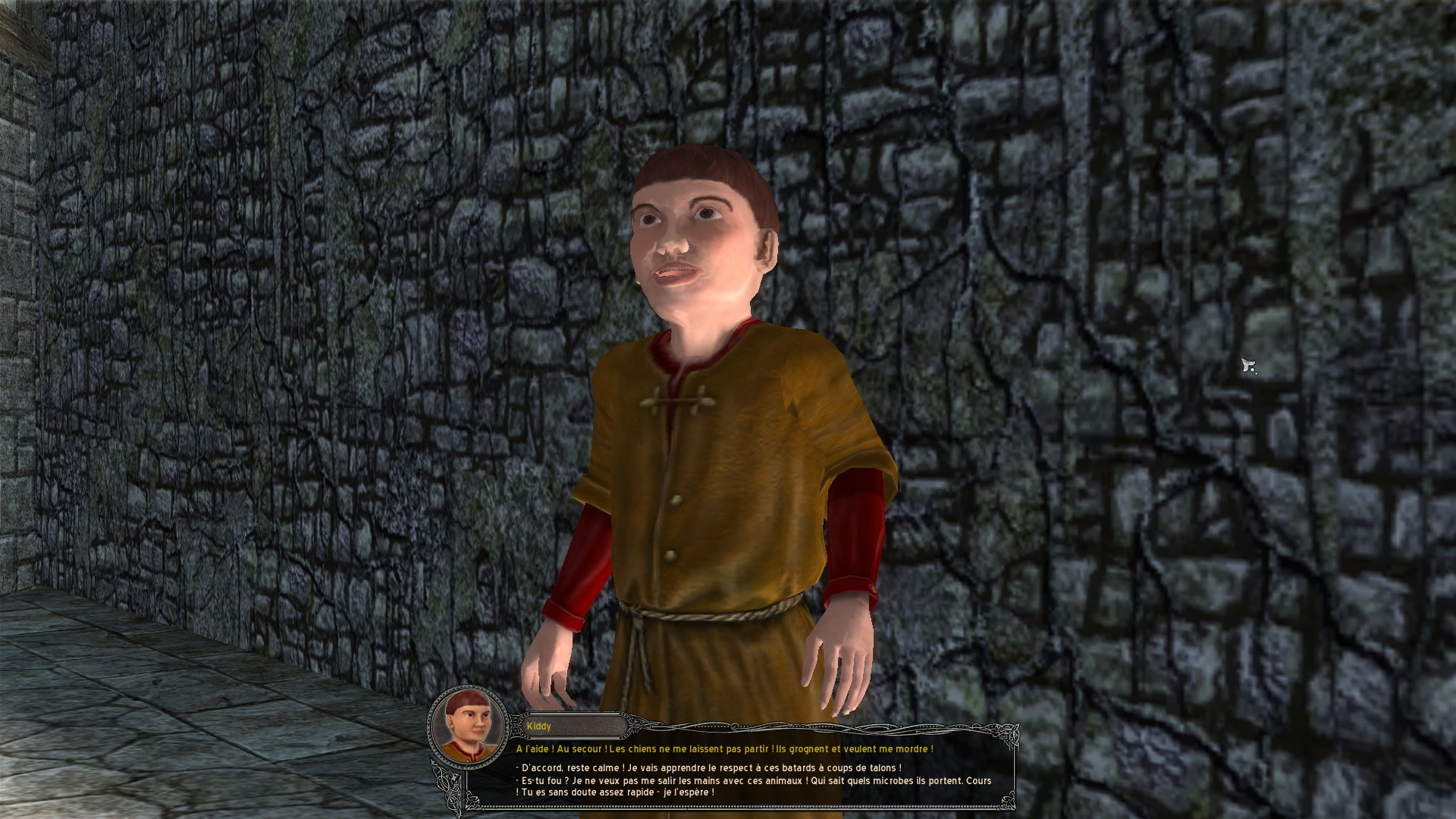 Premier point, le jeu est d’une laideur à en faire pâlir des jeux réalisés sous Adobe Flash, et si on atteint pas les tréfonds du graphisme comme pouvait le faire par exemple Vera Jones : La Légende des sept reliques, World of Chaos donne l’image d’un titre réalisé avec au moins cinq ans de retard, ce qui en 2007 représente un écart plus que conséquent. Mais au delà des graphismes et à fortiori dans un RPG, ce qui importe, c’est la direction artistique, ce que le jeu nous offre comme univers visuel attrayant afin de nous immerger dans son histoire et son monde… Et là encore c’est en dessous du strict minimum. On est dans un univers de fantasy qui ne s’écarte aucunement de tous les codes du genre mis en place depuis Le Seigneur des Anneaux, pas la moindre originalité que ce soit dans les décors, les personnages, les armes… Même les quêtes semblent sortir tout droit de “Comment mener une partie de jeu de rôle sur table pour les nuls” (je ne sais pas si ce livre existe mais vous voyez l’idée). Et rien que ça assassine toute possibilité pour le titre de Brainfactor de se démarquer même face à des titres sortis bien avant lui, en un mot c’est générique au possible. Bien qu’on atteigne pas les sommets de mauvaise traduction d’un Daemon Vector en ce qui concerne la localisation française, World of Chaos est touché par un autre problème majeur : l’absence de traduction de certains dialogues, qui sont restés en allemand. Alors je n’ai rien contre la langue de nos voisins outre-Rhin, mais quand j’achète un jeu en français, je m’attends à ce que l’intégralité du titre soit en Français. Heureusement que le sacro-saint Google Lens me permet de traduire le texte via mon téléphone, mais ce n’est pas parfait non plus…