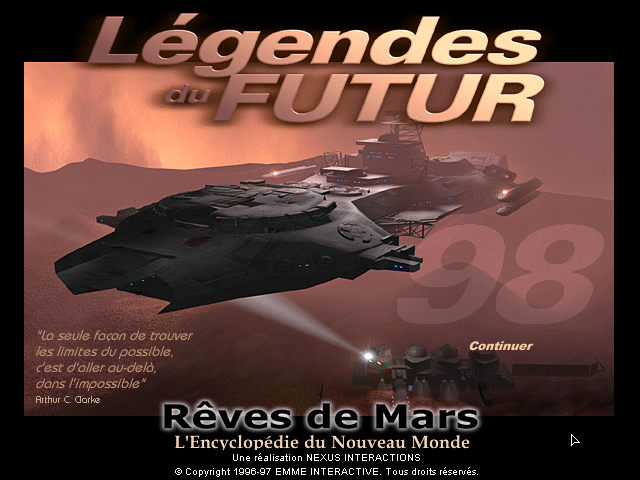 PrésentationQuelle est la face cachée de Mars ? Pourquoi cette planète fascine-t-elle tant les Humains ? Comment a-t-elle découverte, imaginée, fantasmée et explorée ? Peut-on la coloniser ? Autant de questions auxquelle le CD-ROM Rêves de Mars tente de répondre. Spécialisé dans l'imagerie 3D, le studio Nexus Interactions a modélisé les coursives d'une base spatiale dont les pièces sont différentes rubriques à compulser : astronomie, expéditions scientifiques, culture... Les auteurs ont aussi fait preuve d'anticipation en imaginant un scénario de colonisation de la planète rouge en juillet 2026, et des interviews en FMV expliquant les défis du terraforming - ou les opérations à mener pour rendre la planète habitable. La partie scientifique est expliquée en vidéo par Philippe Masson, professeur de géologie planétaire et de planétologie à l'université Paris-Sud (Orsay). On peut regretter l'absence d'un planisphère en 3D qui permettrait de voir Mars sous tous les angles et de suivre ses canaux, ou même d'une section plus ludique, mais il y a assez de contenu pour s'occuper un moment.