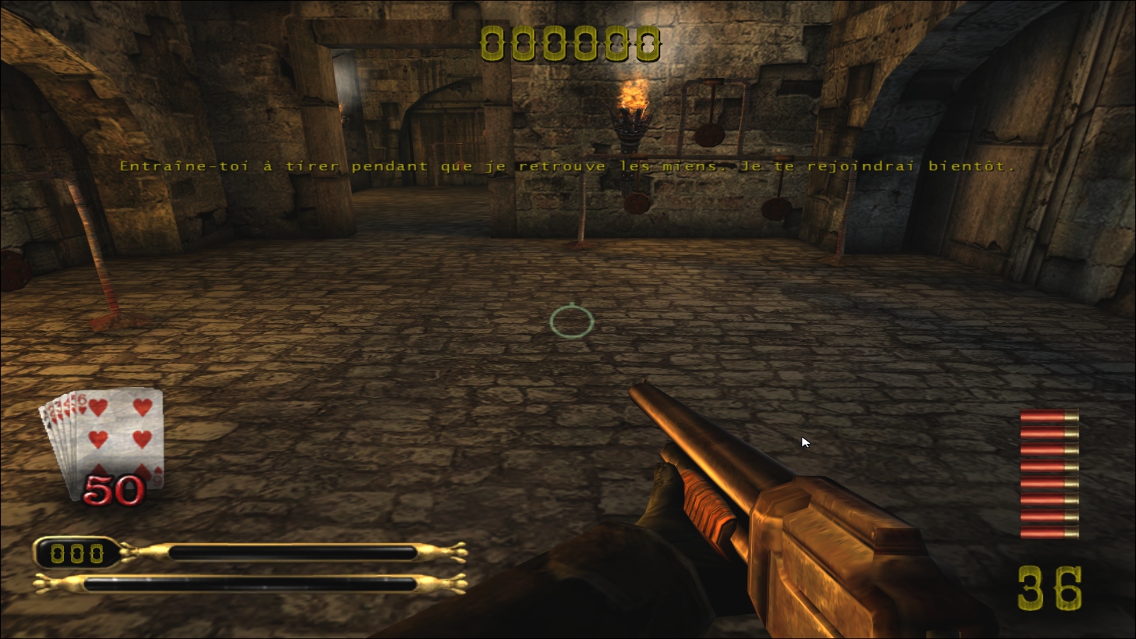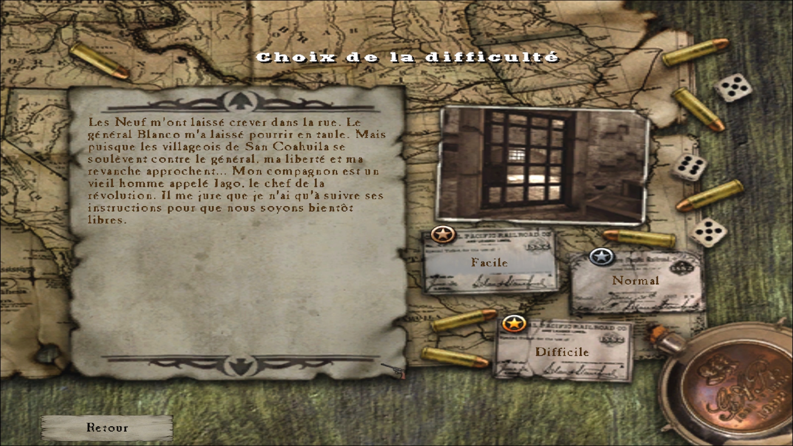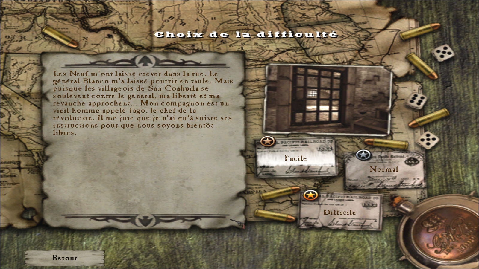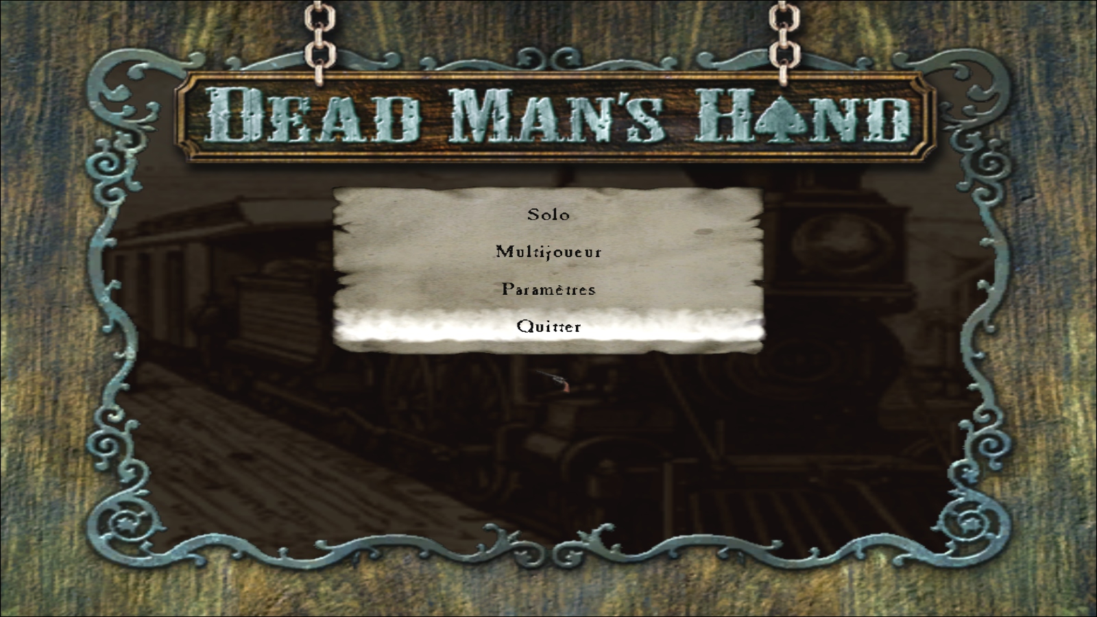 Réalisé sous Unreal Engine 2, Dead Man’s Hand est plutôt joli dans la modélisation de ses personnages, et surtout servi par une direction artistique certes, très classique pour un jeu typé Western, mais diablement efficace, surtout si on accroche au genre. Le jeu est traduit en français mais non doublé, ce que j’ai tendance à considérer comme un bon point compte tenu de la qualité des doublages qu’on croirait sortis d’un film de Sergio Leone. Cette attention portée à la direction artistique vaut aussi pour la direction musicale, bien que les compositions soient là encore extrêmement classiques pour des jeux de ce genre. Un autre bon point que j’aimerais souligner est la qualité de la mise en page du manuel, pensée comme un journal de l’époque, avec publicités, vieilles photos… Un beau manuel fait toujours plaisir à voir, surtout quand ce dernier est en phase avec la diégèse du jeu. Autre petite touche intéressante : il est possible de tirer des mains de Poker en début de partie, et selon les tirages que l’on fait, des bonus plus ou moins importants nous sont donnés, mais attention à ne pas être trop gourmand au risque de tout perdre.