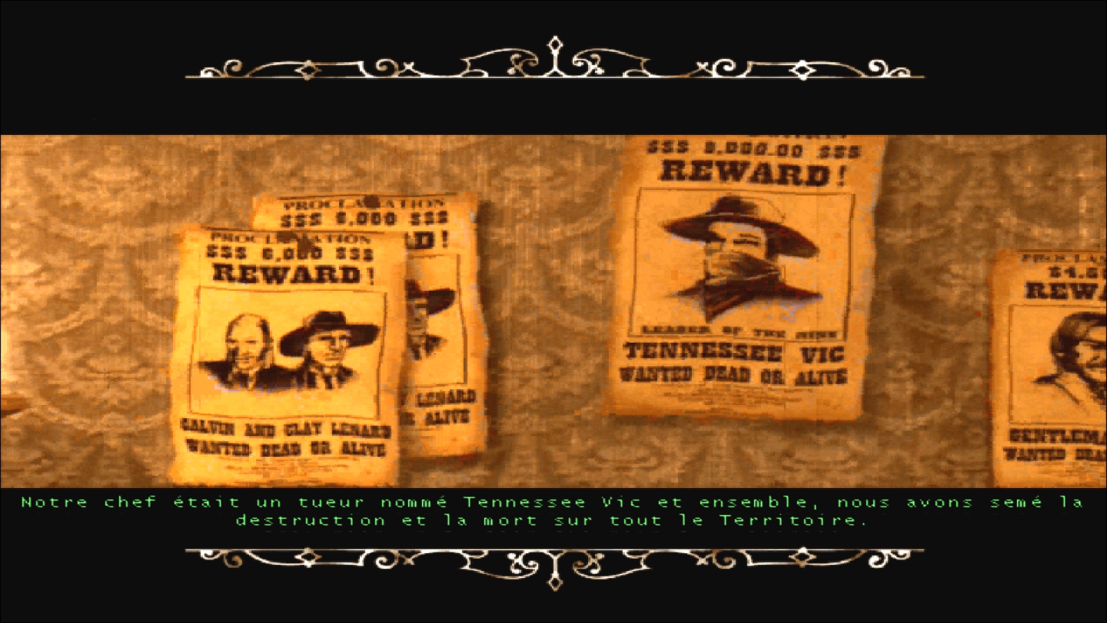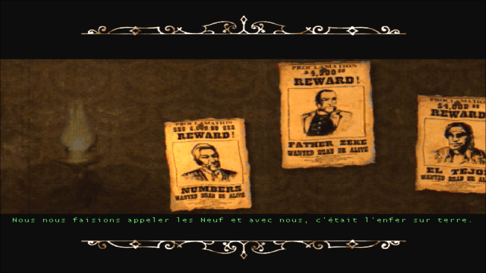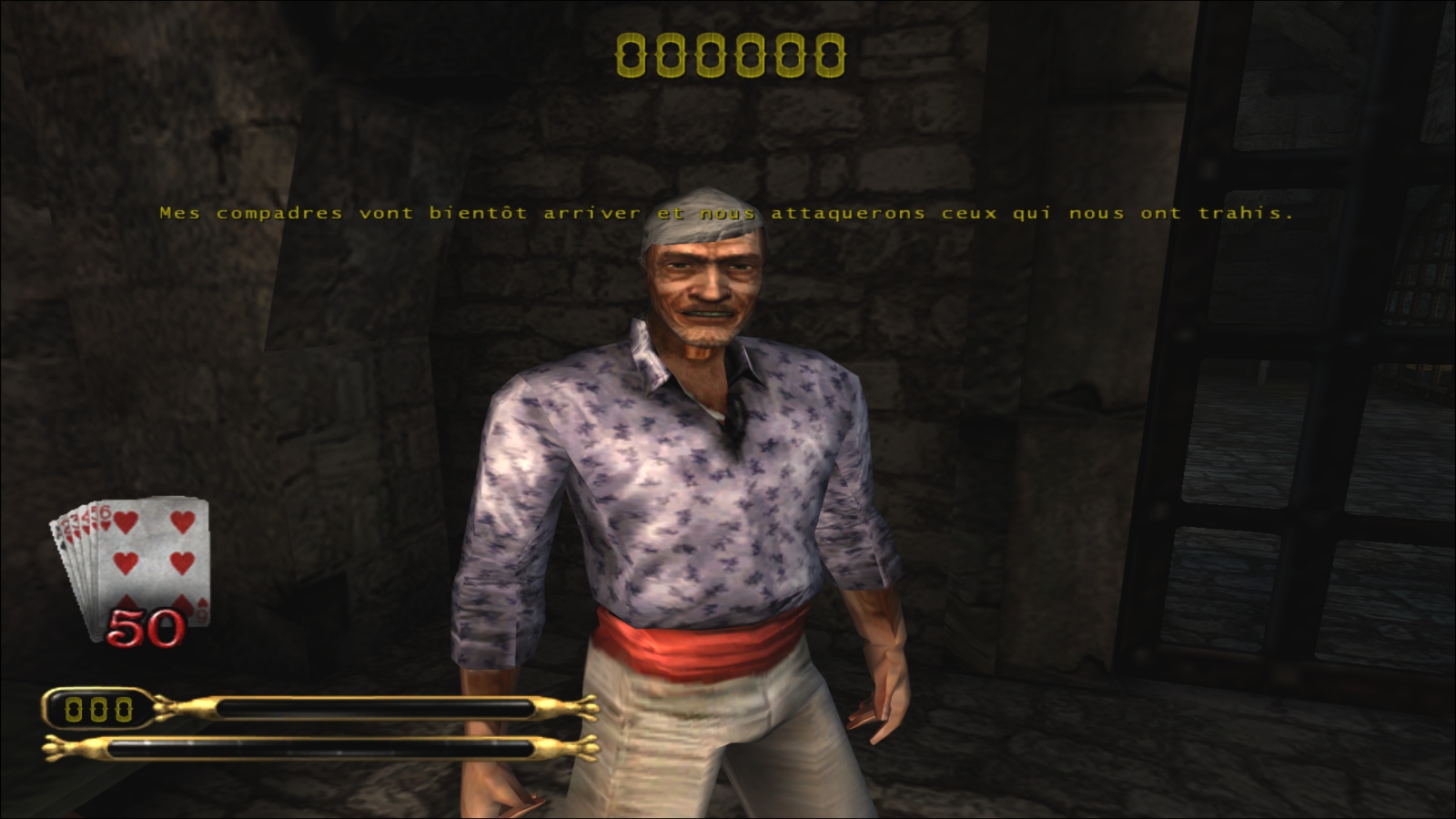 Réalisé sous Unreal Engine 2, Dead Man’s Hand est plutôt joli dans la modélisation de ses personnages, et surtout servi par une direction artistique certes, très classique pour un jeu typé Western, mais diablement efficace, surtout si on accroche au genre. Le jeu est traduit en français mais non doublé, ce que j’ai tendance à considérer comme un bon point compte tenu de la qualité des doublages qu’on croirait sortis d’un film de Sergio Leone. Cette attention portée à la direction artistique vaut aussi pour la direction musicale, bien que les compositions soient là encore extrêmement classiques pour des jeux de ce genre. Un autre bon point que j’aimerais souligner est la qualité de la mise en page du manuel, pensée comme un journal de l’époque, avec publicités, vieilles photos… Un beau manuel fait toujours plaisir à voir, surtout quand ce dernier est en phase avec la diégèse du jeu. Autre petite touche intéressante : il est possible de tirer des mains de Poker en début de partie, et selon les tirages que l’on fait, des bonus plus ou moins importants nous sont donnés, mais attention à ne pas être trop gourmand au risque de tout perdre.