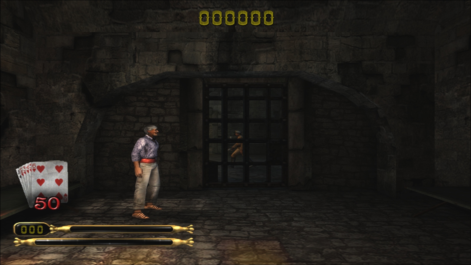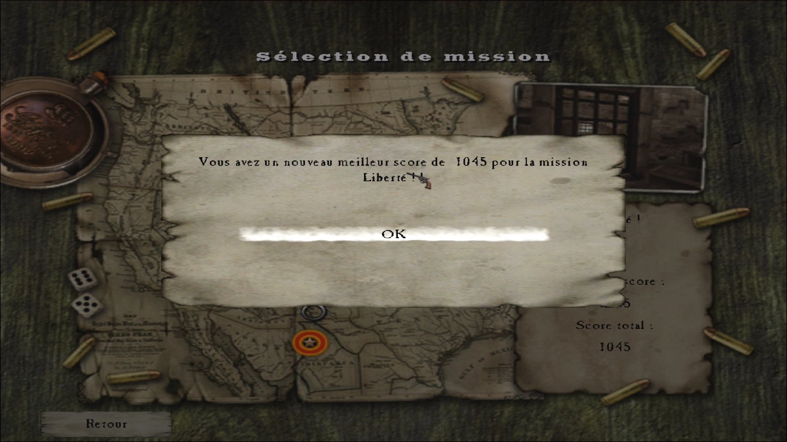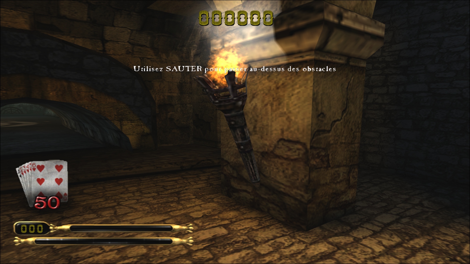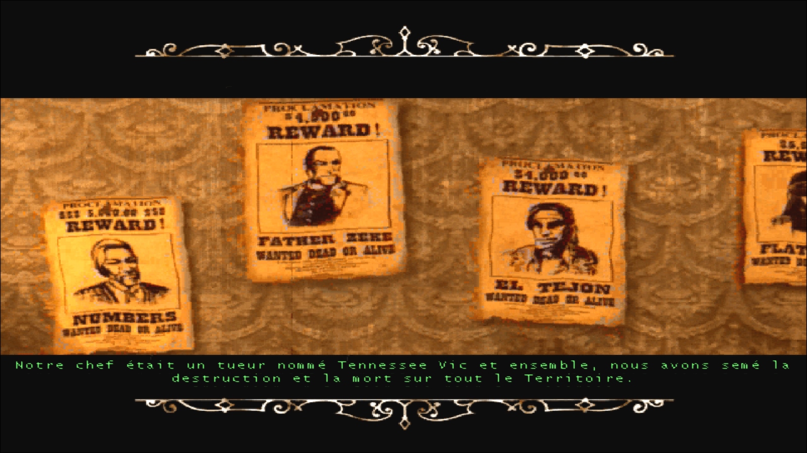 Réalisé sous Unreal Engine 2, Dead Man’s Hand est plutôt joli dans la modélisation de ses personnages, et surtout servi par une direction artistique certes, très classique pour un jeu typé Western, mais diablement efficace, surtout si on accroche au genre. Le jeu est traduit en français mais non doublé, ce que j’ai tendance à considérer comme un bon point compte tenu de la qualité des doublages qu’on croirait sortis d’un film de Sergio Leone. Cette attention portée à la direction artistique vaut aussi pour la direction musicale, bien que les compositions soient là encore extrêmement classiques pour des jeux de ce genre. Un autre bon point que j’aimerais souligner est la qualité de la mise en page du manuel, pensée comme un journal de l’époque, avec publicités, vieilles photos… Un beau manuel fait toujours plaisir à voir, surtout quand ce dernier est en phase avec la diégèse du jeu. Autre petite touche intéressante : il est possible de tirer des mains de Poker en début de partie, et selon les tirages que l’on fait, des bonus plus ou moins importants nous sont donnés, mais attention à ne pas être trop gourmand au risque de tout perdre.