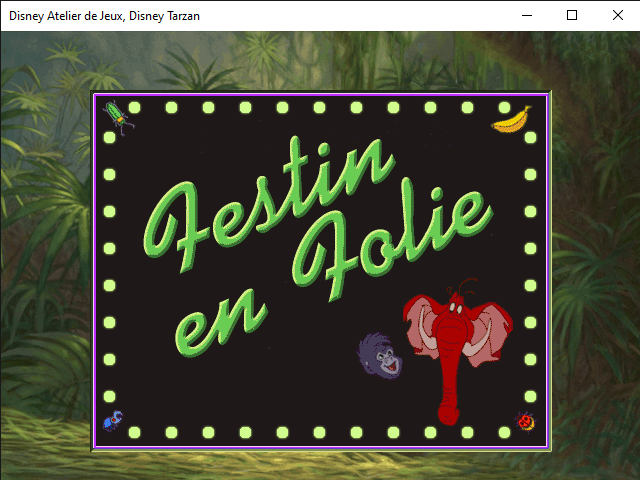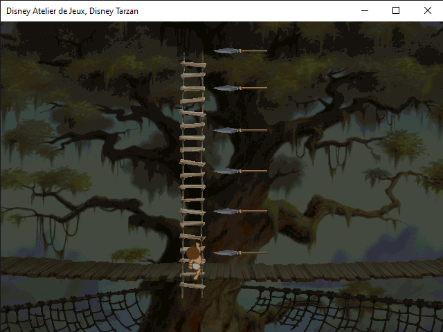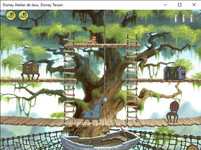 - Cascades de la jungle : Trois niveaux (Tarzan bébé, adolescent puis adulte) : vous devez déménager les meubles présents sur des branches et paliers d'une cabane, et ne pas vous faire attraper par les léopards qui errent sur votre route. Et disposez de trois vies pour aller au bout de ce challenge qui relève du défi.