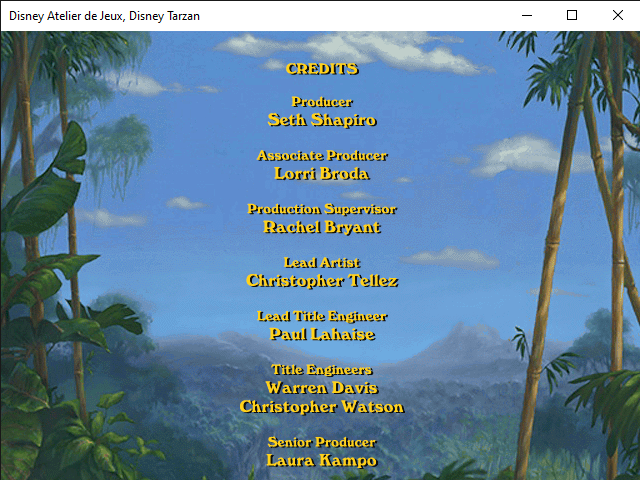ConclusionLe jeu familial des fêtes de fin d'année : Depuis l'explosion du multimédia, Disney Interactive a trouvé la formule gagnante pour capitaliser sur le classique long-métrage de fin d'année. La série des Ateliers de jeux avait déjà brillé avec Toys Story ou le Roi Lion, et cet opus consacré à Tarzan est sans doute l'un des tout meilleurs. Dégustez-le sans modération, il est toujours plein de joie de vivre plus de 25 ans après sa sortie dans les bacs.