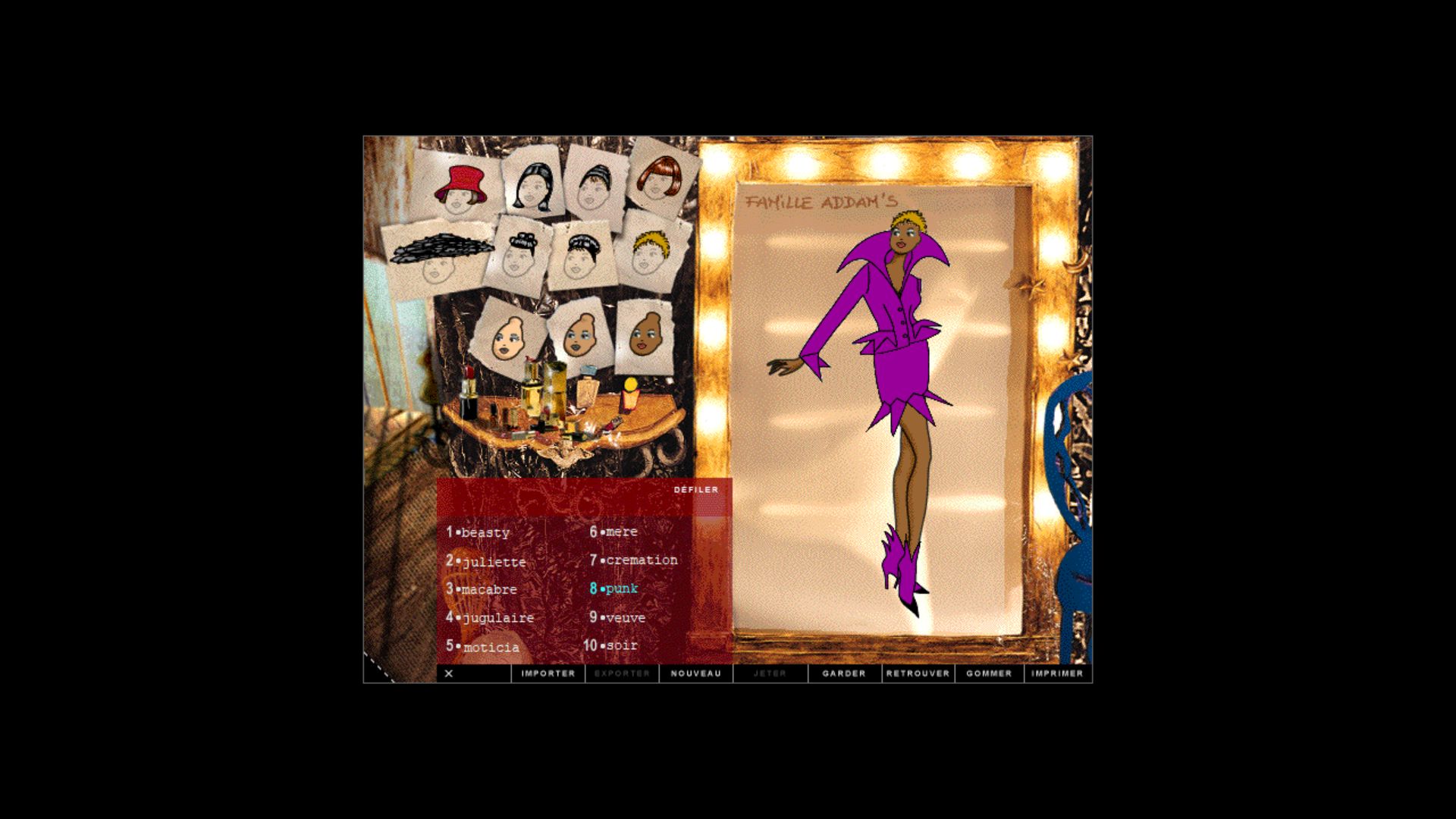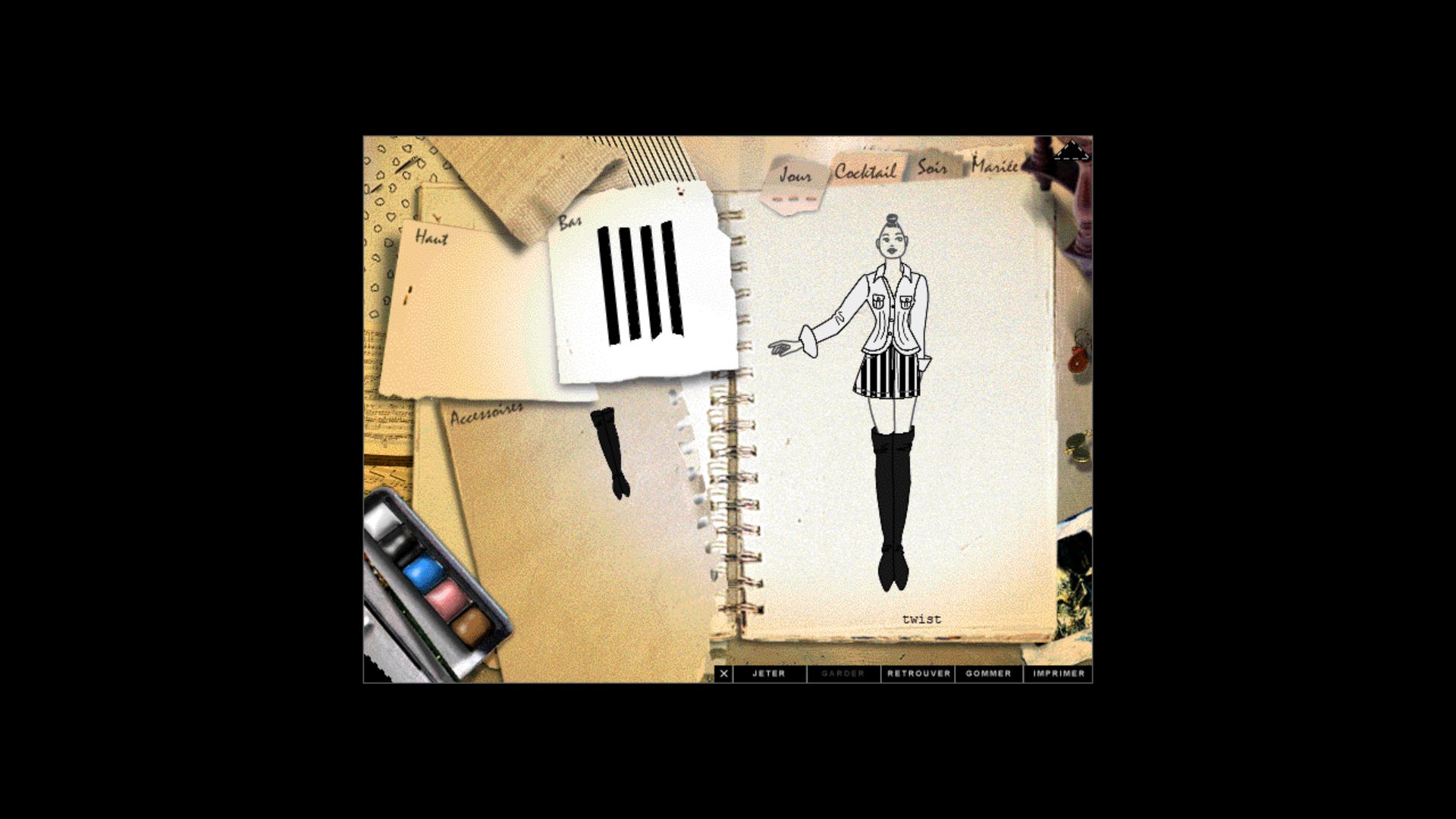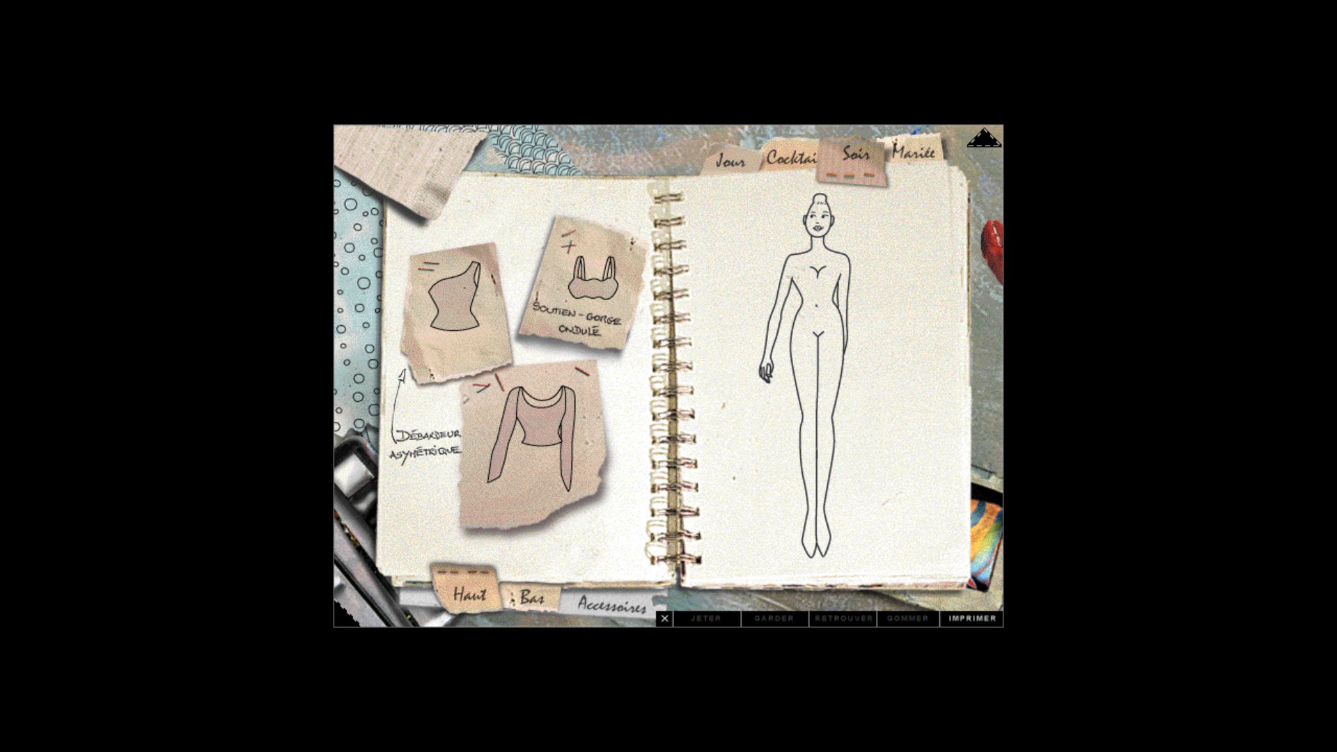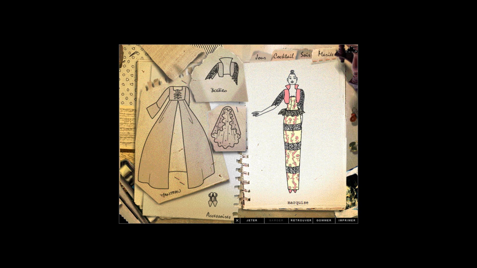 Le but du jeu est simple : mi point and click, mi simulation vous allez devoir tour à tour piocher l’inspiration ici et là dans les divers univers du jeu pour finalement créer de toute pièce une collection haute-couture en vue d’un défilé ! Il vous sera demandé de créer vos modèles, en partant des coupes proposées, mais aussi les tissus, les motifs, les coloris, avant de finalement choisir les accessoires puis le maquillage et les coiffures une fois en coulisses. Puis, le rideau se lève et c’est parti pour les feux des projecteurs ! Aidé, que dis je ! Couvé, par votre guide Anna (les plus aguerris reconnaîtront Pascale Chemin, la voix française de Jane Shepard chez Mass Effect ou Tina Goldstein des "Animaux Fantastiques"), vous pourrez évoluer dans les différentes pièces de la maison et tout ce qu’elles renferment de trésors. Les graphismes en 2D (sauf la "pièce à idée" qui peut être visitée en 3D) particulièrement léchés, accompagnés de musiques et ambiances sonores propres à chaque univers, nous plongent dans un espace hors du temps. Les looks quant à eux, créés par Pascale d’Andon, sont nombreux quoique cohérents selon les thèmes et raviront les plus jeunes comme les plus nostalgiques d’entre nous. Le jeu tourne bien sur la dernière version de Windows et aucun bug n’est à déplorer ! On pourra par la suite exporter nos tenues sur internet ou sur disquette ! Le début des années 2000 verra naître une ribambelle de suites sur PC mais aussi sur papier, Pascale d’Andon se concentrant par la suite sur des cahiers et carnets de mode, édités majoritairement chez Nathan.