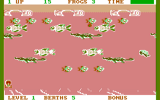 Ca y est, c'est reparti : les batraciens font de nouveau des siennes ! Après l'immense succès de Frogger, les développeurs remettaient cela un an plus tard. Mais comment faire du neuf avec de l'ancien ? Ici, il ne s'agit pas de traverser une route mais bien une grosse mare ! Le principe est toutefois identique : avancez en évitant les obstacles (mortels pour notre pauvre bestiole), utilisez le dos des hippopotames (entre autres) et rejoignez le haut de l'écran. Frogger 2 est une simple variation du premier opus. Compte tenu des limitations techniques, on lui préfera Leaper, plus récent.