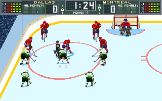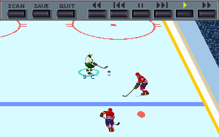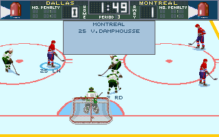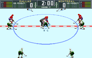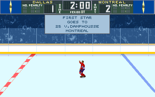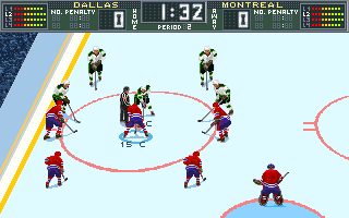 Ma seule expérience se résumant à avoir regardé des matchs à la télévision, je suis mal placé pour juger du gameplay mais dans ce jeu, l'ambiance sonore est un régal entre la voix du speaker, le cri des supporters et les petites musiques d'ambiance comme dans les matchs de hockey. Malgré son âge et ses sprites aux animations limitées (jeu sorti également sur Super Nintendo), l'intensité du match est parfaitement retranscrite, le palet est difficile à suivre (comme en vrai), les contrôles se font avec trois boutons (B) et varient selon que notre équipe a le palet, donc en attaque: B1=passe, B2= Tir frappé ou B3=Tir du poignet (moins fort mais plus rapide en action). Si notre équipe n'a pas le palet et doit défendre, la configuration des boutons sera B1=Change de joueur, B2=Mise en echec et B3=Harponnage. En plus des sons, il est possible d'activer ou pas les hors-jeux, le icing, les changements de lignes (touches F1 à F4) et les pénalités dans les options. On se prend facilement au jeu et même si parfois, il est possible de marquer un but chanceux depuis l'autre bout du terrain, la victoire n'est pas facile et il faut s'accrocher pour réussir. On peut faire un match, une saison de 11, 42 ou 84 matchs ou directement accéder aux playoffs en 3, 5 ou 7 matchs.