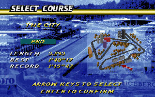 Présentation du jeuPremier contact avec l'écran d'accueil, l'image en arrière plan des différents menus nous présente une Benetton 194 un peu floutée et un casque de Nelson Piquet, les amateurs de F1 apprécieront. Trois choix s'offrent à vous, uniquement en anglais :