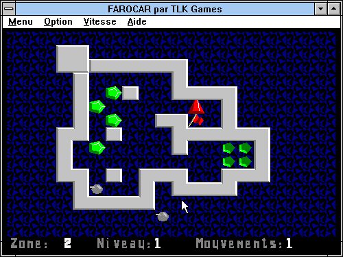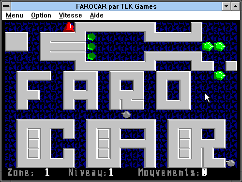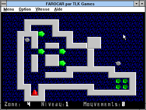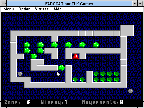 Dans ce petit shareware français, il n'est pas question de voiture. Farocar est simplement un clone du classique Sokoban réalisé avec des graphismes vectoriels. Le principe est le même, il faut déplacer des cristaux verts sur leurs emplacements. Le programme vous prévient si un cristal est bloqué, et il met à votre disposition des bombes, en nombre variable selon le niveau de difficulté, pour détruire des murs.