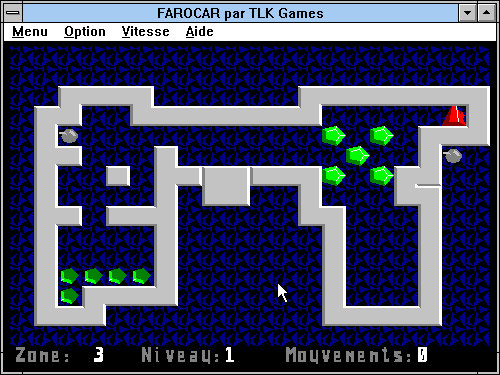 PrésentationDans ce petit shareware français, il n'est pas question de voiture. Farocar est simplement un clone du classique Sokoban réalisé avec des graphismes vectoriels. Le principe est le même, il faut déplacer des cristaux verts sur leurs emplacements. Le programme vous prévient si un cristal est bloqué, et il met à votre disposition des bombes, en nombre variable selon le niveau de difficulté, pour détruire des murs.