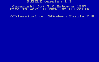 Simplement appelé "Puzzle", ce soft est un bijou de freeware développé par un technicien qui a laissé deux initiales et un nom (T.C. Osborne) et une année de développement (1987). Puzzle est le jeu idéal qui se lançait après avoir booté le PC, à l'heure où les Amstrad, les Sinclair ou les Apple II régnaient en maîtres dans l'espace encore fermé de l'informatique grand public.