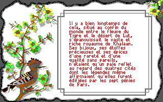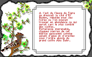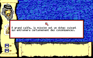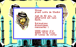 Vous choisissez un personnage (dont le choix influencera le niveau de difficulté) et votre objectif est de devenir Calife pour protéger le peuple. A vous d'unifier les différentes cités sous votre bannière avant qu'un ennemi mystérieux fasse son apparition. Telle est la prophétie et vous feriez bien de la prendre au sérieux ! La guerre semble presque inévitable mais le commerce n'est pas totalement négligé ce qui permet de varier la manière de gagner. Pour le reste, on est dans un jeu qui apparaît rétrospectivement classique tant les mécanismes de ces années-là ont été copiés. Il y a de bonnes idées comme le vol, l'espionnage, la corruption mais qui sont coûteuses pour être efficaces. Les vieux routiers des jeux de stratégie pourront s'en passer.