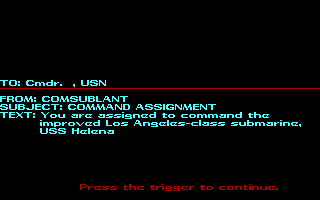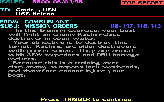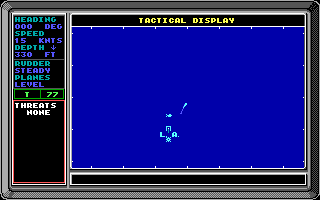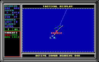 Très cohérent (votre mission a un impact sur le déroulement de l'histoire), le jeu possède un aspect stratégique très en avance sur son époque. C'est du côté de la simulation que cela pêche. Enfin, si on peut parler de simulation, car le jeu vous propose plus un affrontement limité sur une carte avec des leurres et des torpilles, histoire de faire régner votre loi et d'éviter de finir au fond de l'eau. Comme on pouvait s'y attendre pour la fin des années 80, le jeu est très exigeant à prendre en main. Ceux qui cherchent une simulation simple devront passer leur chemin. A un haut niveau de difficulté, c'est même carrément l'horreur et je ne saurais trop conseiller un mode de difficulté facile pour démarrer. Exigeant, intéressant par son traitement stratégique, le jeu est assurément à part dans la longue lignée des jeux de sous-marins.