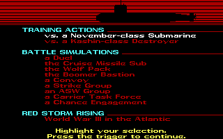 Dans le royaume des simulations maritimes, c'est surtout en-dessous des mers qu'il vous faut regarder. A de rares exceptions près, ce sont les simulations sous-marines qui se sont imposées. Il faut dire que les programmateurs ont su utiliser les possibilités croissantes des machines de l'époque pour proposer des simulations toujours plus réalistes. Que de chemin parcouru entre Gato et Silent Service qui avait enthousiasmé les joueurs de l'époque. Quatre ans plus tard, Microprose se lançait dans une nouvelle simulation de sous-marin : il s'agissait de Red Storm Rising. Microprose, c'était l'entreprise des simulations avec F-15 strike Eagle II ou encore M1 Tank Platoon. Dans ce contexte, c'est peu dire que le titre était attendu sinon regardé de près par les amateurs du genre. Histoire d'attiser encore plus l'intérêt des joueurs, l'entreprise américaine avait acquis les droits d'adaptation d'un roman de Tom Clancy, l'un des auteurs les plus prolixes et respectés de ce temps-là. Le tableau d'ensemble est très sombre : la mer du Nord est le théâtre d'un affrontement entre américains et soviétiques. Il vous revient de garder la suprématie américaine afin d'éviter une invasion du Nord de l'Europe par le géant russe. Le jeu vous propose différents paramètres comme les types de sous-marins.