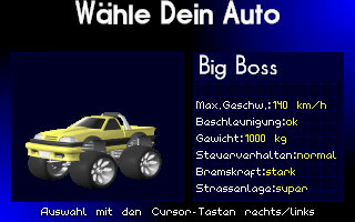 LancementAvec Dosbox ou D-Fend Reloaded, ce jeu se lance sans difficulté. Amusez-vous bien et attention au gras sur vos doigts : Ca n'aide pas à gagner la course. ^^