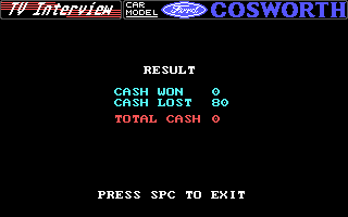 Tu montes en grade et tu upgradesPour le jeu proprement dit, il entre en concurrence avec des jeux de course de cette année 1988 comme out run, Turbo Cup ou encore test drive. Mais à la différence de ses devanciers, celui-ci est une vraie simulation. Le clavier permet de jouer avec les flèches (haut pour accélérer, droite et gauche, bas pour freiner, retour pour passer les vitesses et W pour aller au magasin quand vous avez fini une course et que vous avez gagné de l'argent). Si vous avez un joystick ce sera mieux bien évidemment !