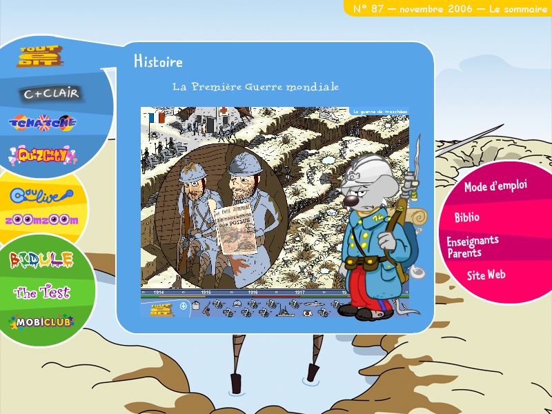 Un dossier d'actualitéComme le suggère l'image de couverture, mois de novembre oblige, le dossier du mois porte sur la guerre de 14-18, la "Grande Guerre". C'est un dossier court et très visuel, en raison du format du magazine et de l'âge des lecteurs attendus, mais étonnamment complet. En quelques clics et quelques images au commentaire clair, on comprend et on enregistre beaucoup de choses, selon son âge bien sûr. Et je suis sûr qu'on a envie d'aller plus loin.