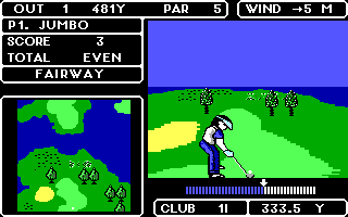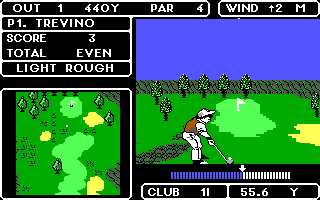 On dit parfois que la vie est un sport de combat... Si si... On dit aussi que la sociologie est un sport de combat... Apparemment, cela s'applique au golf aussi ! Bienvenue dans Lee Trevino's Fighting Golf. Lee Trevino ? C'est un golfeur américain qui eut un beau palmarès des années 70 au milieu des années 80. Moins connu que le britannique Nick Faldo à la même époque, il a associé son nom à un jeu vidéo. Le jeu est sorti en 1988 sous de multiples supports, dont en borne d'arcade, en 1988. C'est la version dos PC qui nous est donnée de voir ici. L'une des innovations du jeu consiste en la capacité à choisir son personnage parmi les quatre disponibles. Si la chose est aujourd'hui banale, elle ne l'était pas à l'époque. Chaque avatar, trois hommes et une femme, ont chacun leurs caractéristiques. En fonction de votre style de jeu, vous préférerez l'un(e) ou l'autre. Pour le reste, il s'agit d'une simulation assez typique des années 80. C'est à dire que le gameplay consiste à choisir le type de club et la force et la direction de votre coup (avouez qu'on n'a pas beaucoup évolué depuis). Les graphismes colorés reflètent bien les possibilités techniques de l'époque. Bien pixelisés sur un écran 4K, on leur trouvera une certaine indulgence sur des écrans de formats plus standards.