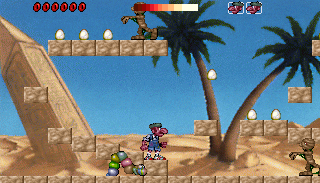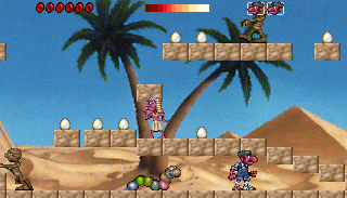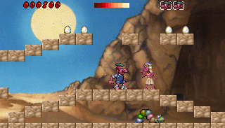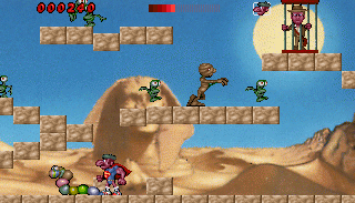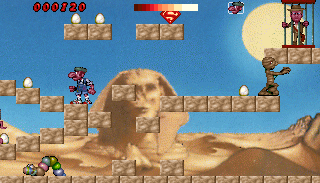 Vous (Luigi) et votre ver (Spaghetti) devez écraser les oeufs ennemis. Pourquoi cela ? Tout simplement, car des aliens au look tout aussi ridicule que le héros ont envahi la Terre. Pour s'en débarrasser, ruinez la future progéniture des aliens et libérez au passage d'autres héros (plus conformes aux standards hollywoodiens comme Luke Skywalker). A chaque étape, vous aurez droit à tous les poncifs du genre. En Egypte, vous aurez forcément les momies et en Transylvanie, les vampires bien sûr ! Chaque niveau est composé de tableaux dans ce jeu de plate-forme classique. Il fut bien reçu à sa sortie car il cassait les codes bien établis du genre avec sa forme parodique. Si vous maitrisez à la perfection le gameplay de cette époque, le jeu ne paraitra pas particulièrement difficile. Allez, vous mangerez bien une omelette d'aliens ce soir ?