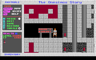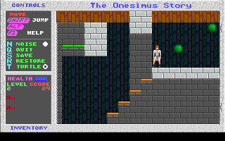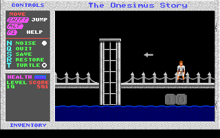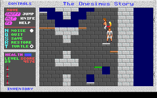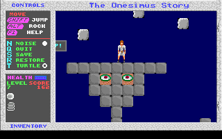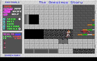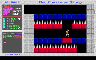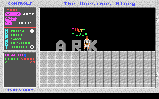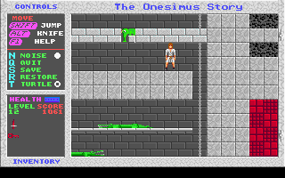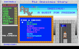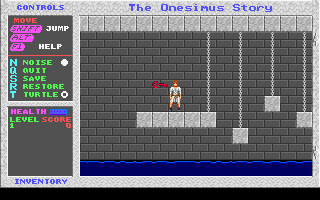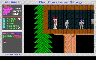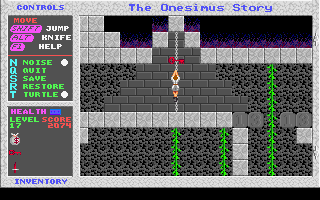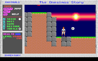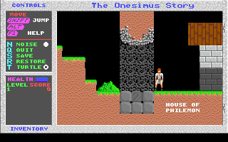 Onesimus, esclave de Philemon, aspire à la liberté : briser les chaînes de sa condition d'esclave et rejoindre Saint-Paul pour avoir la révélation du Christ. Inspiré de la légende d'Onésime, ce jeu est développé avec le concours d'Epic MegaGames, qui a réinvesti son moteur de jeu de l'illustre trilogie Jill of the Jungle. Si vous avez déjà joué au jeu susnommé, les explications qui suivent ne seront pas utiles et vous pourrez filer à la conclusion en fin de test. Mais si vous ne connaissez pas Jill of the Jungle, le jeu d'Onesimus en reprend non seulement le moteur et les écrans graphiques, mais aussi les commandes et les musiques !