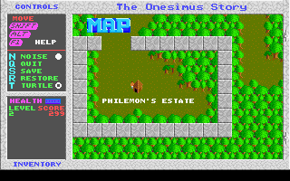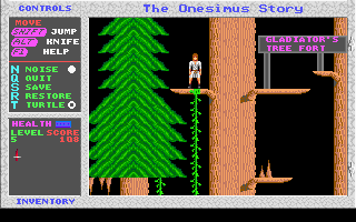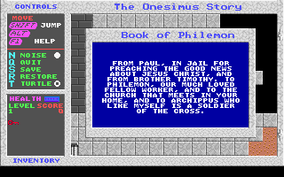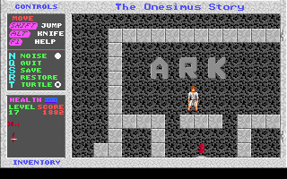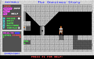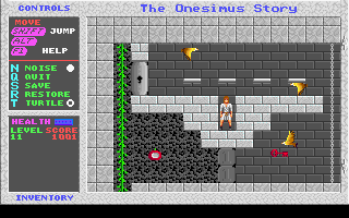 Mangez des pommes !Onesimus, esclave de Philemon, aspire à la liberté : briser les chaînes de sa condition d'esclave et rejoindre Saint-Paul pour avoir la révélation du Christ. Inspiré de la légende d'Onésime, ce jeu est développé avec le concours d'Epic MegaGames, qui a réinvesti son moteur de jeu de l'illustre trilogie Jill of the Jungle. Si vous avez déjà joué au jeu susnommé, les explications qui suivent ne seront pas utiles et vous pourrez filer à la conclusion en fin de test. Mais si vous ne connaissez pas Jill of the Jungle, le jeu d'Onesimus en reprend non seulement le moteur et les écrans graphiques, mais aussi les commandes et les musiques !