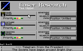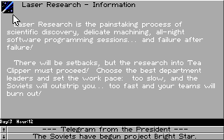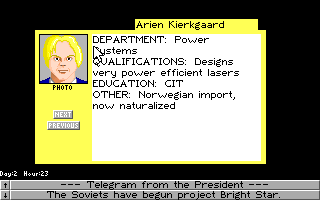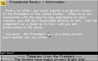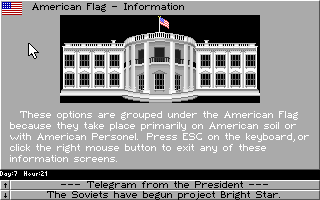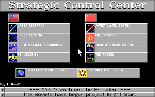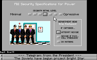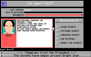 C'était bientôt la finAux tournants des années 80 et 90, bon nombre de titres ayant pour traits la politique et l'espionnage étaient sortis. Ils se nommaient Covert Action, Shadow President, Hidden Agenda... ou encore Crisis in the Kremlin. Ils étaient soit orientés action soit tournés vers la gestion/stratégie. C'est dans cette seconde catégorie que l'on peut placer le Cardinal du Kremlin. Le jeu vidéo est une adaptation d'un roman d'espionnage signé Tom Clancy, le maitre des romans de ce genre à cette époque. Il est la suite de The Hunt for Red October. En tant qu'expert de la CIA, vous devez empêcher l'U.R.S.S. de faire main basse sur un agent de premier plan infiltré au Kremlin (et baptisé "le cardinal") tout en permettant aux U.S.A. de gagner la guerre des étoiles grâce à la construction d'un système anti-missiles. Le jeu se présente sous la forme de tableaux agrémentés d'images servant à déterminer si vous réussissez à avancer sur votre projet anti-missile et à saboter les efforts russes.