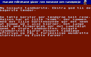 Vous aimez le sourire hollywoodien ? Vous ne jurez que par des dents blanches et bien entretenues ? Vous êtes danois ? Alors, vous avez peut-être été influencé.e par un advergame ou jeu publicitaire. Certains étaient subtils et ne montraient qu'à peine le produit à l'image des jeux de Mandarine software, d'autres mettaient en scène des professions... En bref, il existe une grande variété. Le jeu publicitaire dont il est question a été financé par Colgate pour faire la promotion d'une bonne hygiène bucco-dentaire. Si vous parlez les langues scandinaves, vous pourrez suivre les conseils. Sinon place à un jeu de plate-forme tout ce qu'il y a de plus standard. Vous êtes une dent et à coup de dentifrice, vous devez éliminer les ennemis qui pourraient vous causer des gros soucis. Pour maintenir votre sourire parfait, lancez-vous !