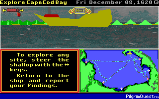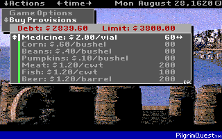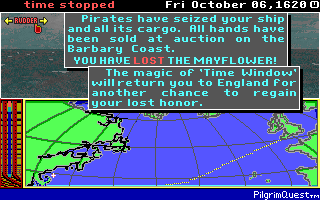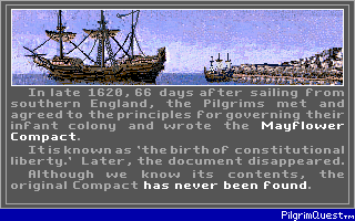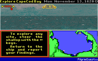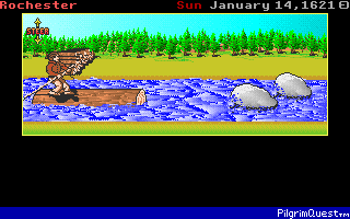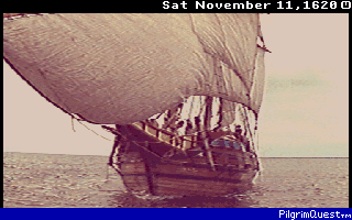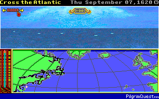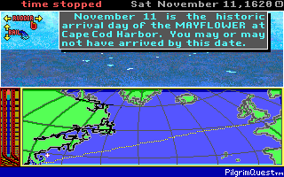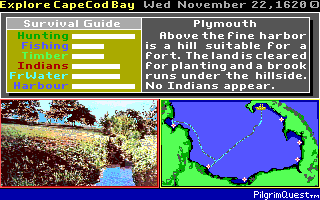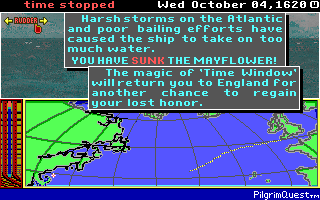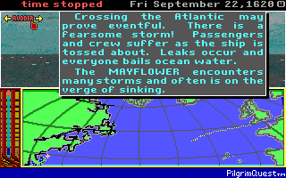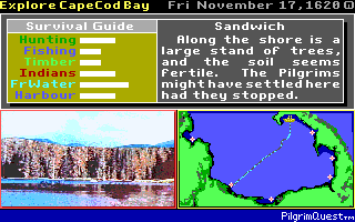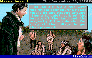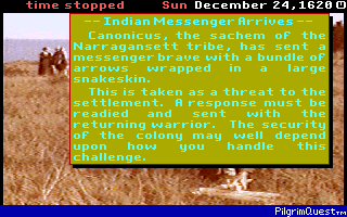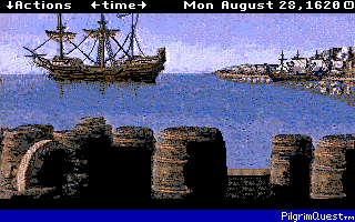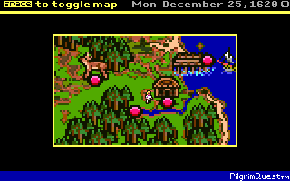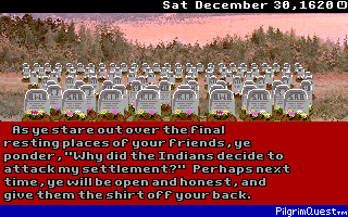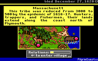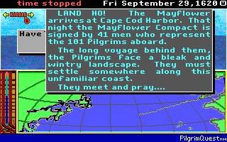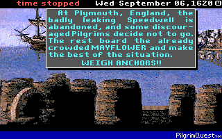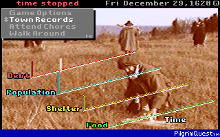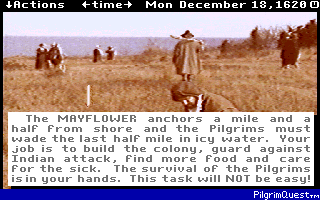 Vous aimez Pocahontas ? Vous l'avez regardé 100 fois et vous êtes incollable sur le Mayflower et les premiers pas de la colonisation anglaise en Amérique du Nord. Vous ne serez donc pas dépaysé.e. PilgrimQuest est un jeu de gestion sorti en 1991. Il est constitué de plusieurs phases à la manière d'autres jeux antérieurs et postérieurs. Le titre démarre sur les quais d'Angleterre. Juste avant d’appareiller, vous utilisez votre crédit pour acheter des vivres et des médicaments. La traversés ne sera pas de tout repos et il vous faudra sans doute plusieurs essais avant d'arriver à bon port. Difficile, cette phase du jeu pourra être zappée moyennant des points d'action. Une fois à terre, vous devez choisir le bon coin pour y implanter votre colonie. Étant donné que le jeu s'inspire des premiers colons, vous feriez bien de suivre leur exemple. L'objectif est de prendre une terre la plus riche du point de vue agricole, de la pêche, de la chasse... Car la phase suivante concerne votre établissement dans le nouveau monde. Vous comprendrez vite tout l'utilité de maintenir des bonnes relations avec les premières nations. Le troc assurera votre survie le premier hiver. Car le Mayflower a accosté lors de la pire saison, novembre. Il vous faudra donc attendre le printemps suivant pour planter et l'été voire l'automne pour récolter. Au menu citrouille, faisans... Entre-temps il vous faudra soigner vos colons et construire vos premiers bâtiments.